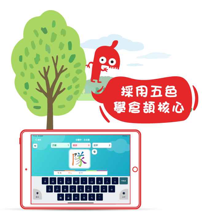 <中小學生學倉頡>採用成效顯著的五色取碼技術,將每個練習字按其取碼次序分拆成不同顏色,讓學生更容易掌握正確的倉頡字根及取碼順序。